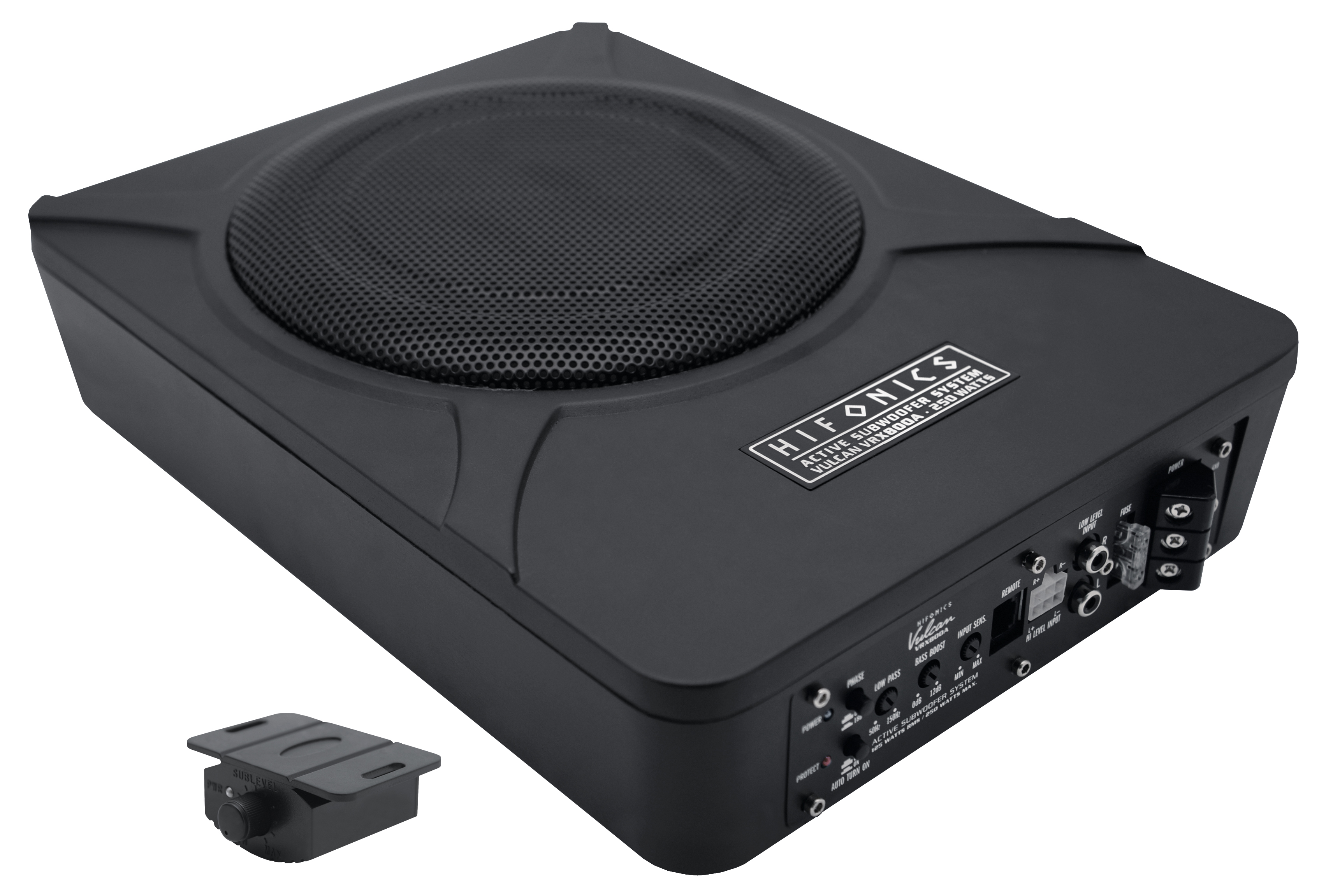Mit den neuen VULCAN VRX Modellen erweitert HiFonics nun sein Sortiment um bassstarke Untersitz-Subwoofer in der 20 und 25 cm Klasse mit Vollalugehäuse. Diese Subwoofer überzeugen nicht nur mit attraktiven Preisen, sie trumpfen wie gewohnt auch mit der von HiFonics Fans weltweit geschätzten, hohen Verarbeitungsqualität und Vollausstattung auf. In vielen preiswerten Untersitz-Subs kommen oft Sparschaltungen im Verstärkerbereich oder gar billige ICs zum Einsatz. Nicht so in den beiden neuen HiFonics Modellen. Beide VULCAN VRX Subs verfügen über vollwertige Class A/B MosFet-Endstufen, die sehr laststabil sind und immer ordentlich Dampf liefern. Mit 250 Watt max. im 8“ (20 cm) bzw. 300 Watt max. im 10“ (25 cm) Modell heizen sie den Spezialtieftönern mächtig ein. Die Subwoofer haben zudem besonders stabile Membranen, um den hohen Drücken, die in den kleinen Gehäusen durch die Kompression des Luftvolumens auftreten, gut standhalten zu können. Herkömmliche Bässe mit Standardmembranen wären hier völlig ungeeignet würden bersten. Mit regelbarem Lowpass Filter, Bass-Boost, schaltbarem Phase Shift und einer Basspegel- Fernbedienung gelingt die Anbindung an die Anlage nahezu perfekt. Selbstverständlich verfügen beide zusätzlich auch über einen High-Level Eingang mit Einschaltautomatik, um den Anschluss z.B. an Werksradios ohne Cinch Ausgang ebenfalls zu gewährleisten.